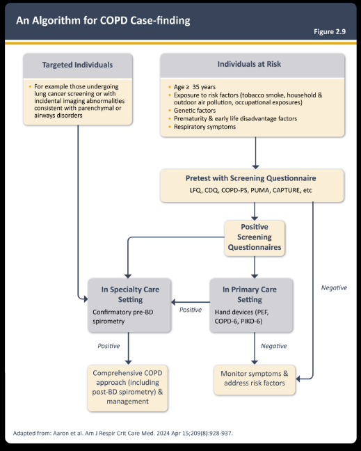 Att leta efter fall kan ske antingen aktivt, genom att proaktivt söka för individer som presenterar symtom, eller opportunistiskt, som genom att utföra diagnostisk spirometri bland personer aktuella för lungcancerscreening. En ny studie som nu refereras i GOLD randomiserade personer med symtom men utan diagnos på astma eller KOL till att antingen få riktade insatser eller fortsätta i ordinarie vård. Interventionsgruppen hade bättre livskvalitet och hälsoutfall samt lägre sjukvårdskonsumtion jämfört med de som fick ordinarie vård, vilket visar att tidiga insatser lönar sig. 2 Denna studie bidrar också till att GOLD rekommendrar att aktivt leta fall, det vill säga att alltid utföra spirometri på personer med symtom eller riskfaktorer.