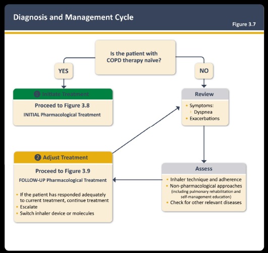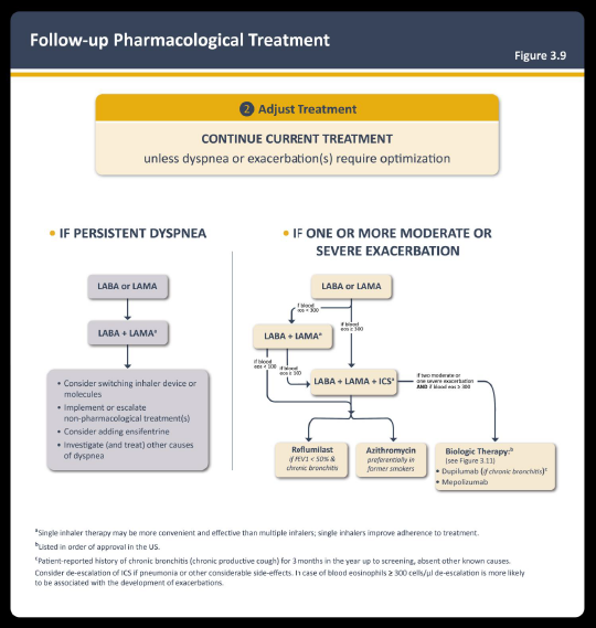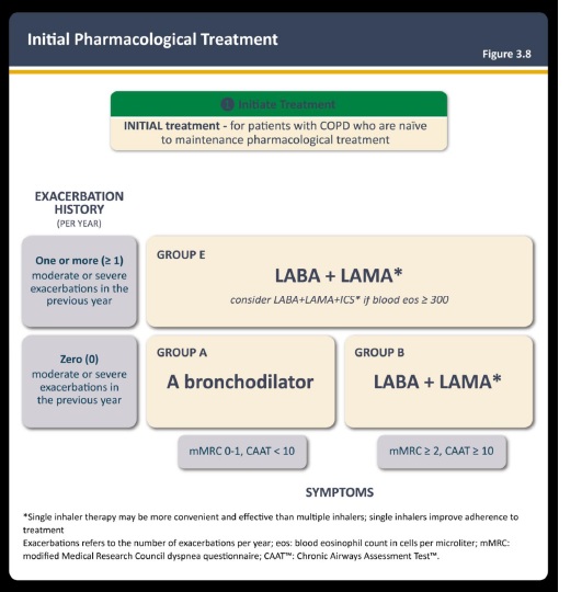 För behandlingsnaiva patienter föreslås initiering baserat på individuell bedömning av symtom och exacerbationsrisk utifrån ABE-klass och eosinofilnivåer. För patienter som riskerar exacerbation (grupp E) där ICS är motiverat, avråder GOLD från ICS+LABA eftersom LABA+LAMA+ICS har visat sig vara bättre för denna patientgrupp.