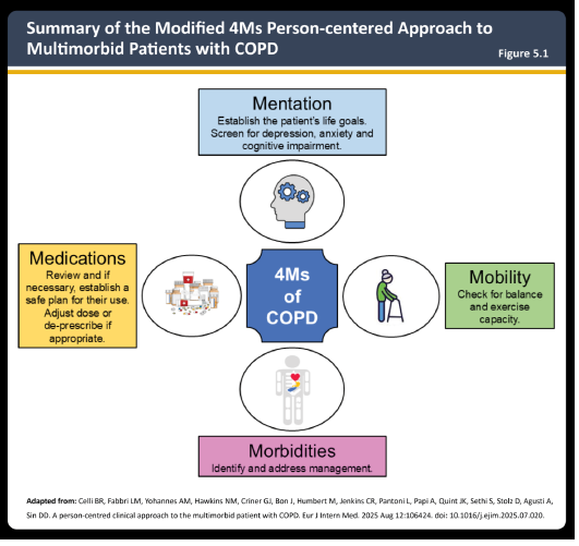 För att bättre hantera dessa syndemiska effekter introduceras ett personcentrerat förhållningssätt till multisjuka patienter med KOL, en anpassning av ”4M” från Institute for Heathcare Improvement. Det omfattar de fyra hörnstenarna Mentalt, mobilitet, morbiditet och mediciner. Mentalt innebär både att definiera patientens hälsomål och psykiska mående. Mobilitet omfattar bedömning av balans och skörhet, plus 6-minuters gångtest, en utmärkt prediktor för överlevnad vid KOL. Rätt mediciner, i hanterbar mängd, för att undvika polyfarmaci. Morbiditet: det är avgörande att identifiera alla samsjukligheter för att hantera dem och förbättra utfall.