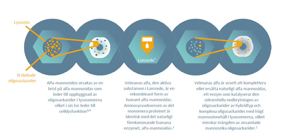 Lamzede® (velmanas alfa) är en enzymersättningsterapi för behandling av icke-neurologiska manifestationer hos patienter med lindrig till medelsvår alfa-mannosidos.1